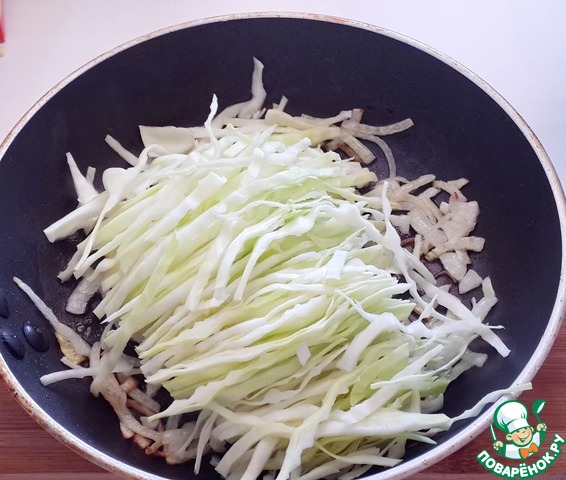 Добавьте нарезанную молодую капусту и обжарьте всё вместе около 15 минут, добавьте соль по вкусу.