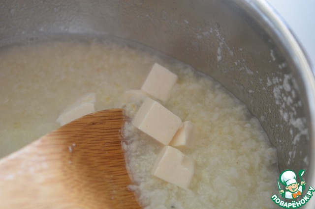 Затем влейте молоко, добавьте сахар и сливочное масло. Варите около 30 минут на слабом огне, периодически помешивая.