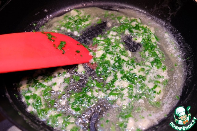 В сковороду добавить сливочное масло, чесночную кашицу, зелень петрушки. Расплавить масло вместе приправами.