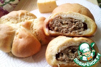 Булочки выложить на пекарский лист, выстланный пергаментом, затем смазать взбитым яйцом, поставить на расстойку на 10-15 мин., затем отправить духовой шкаф, выпекать до готовности.