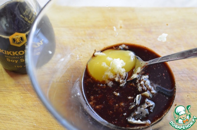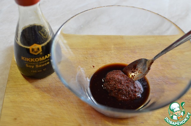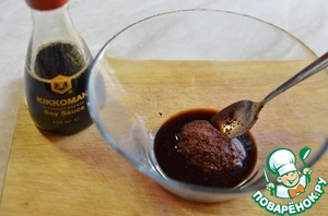 В миске соединить соевый соус Киккоман, бальзамик и аджику