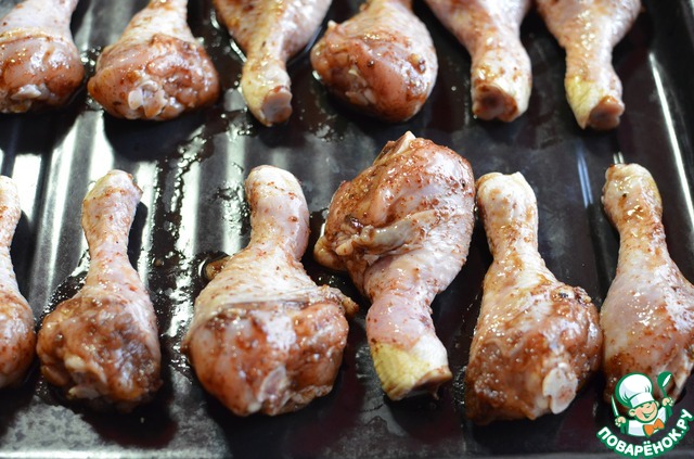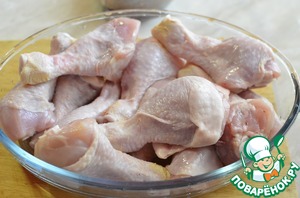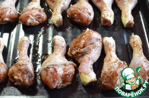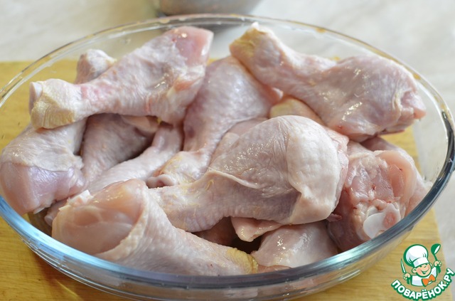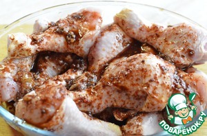 Покрыть маринадом и мариновать около 2 часов при комнатной температуре. Этого времени будет достаточно, для того, чтоб голени хорошо промариновались.