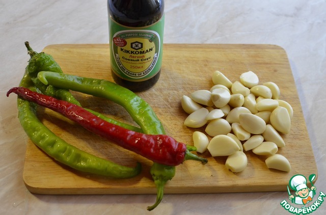 ... с очень жгучим перцем в соевом соусе. Я сомневаюсь, в какую группу заносить рецепт, в маринад или соусы. Дело в том, что это два в одном. С одной стороны чеснок и перец в соевом маринаде, который идет в качестве острой закуски, а с другой стороны ультра-острый соевый соус. Очень остро! Любителям огня во рту посвящается!