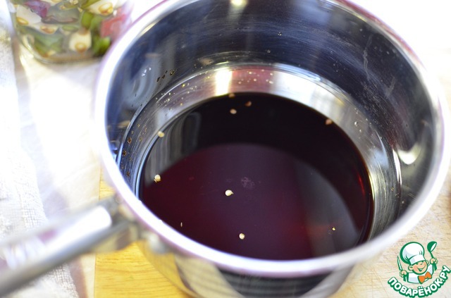 После 4 часов сливаем соевый соус и ставим на плиту. Доводим до кипения. На этом шаге дружно чихала вся семья!