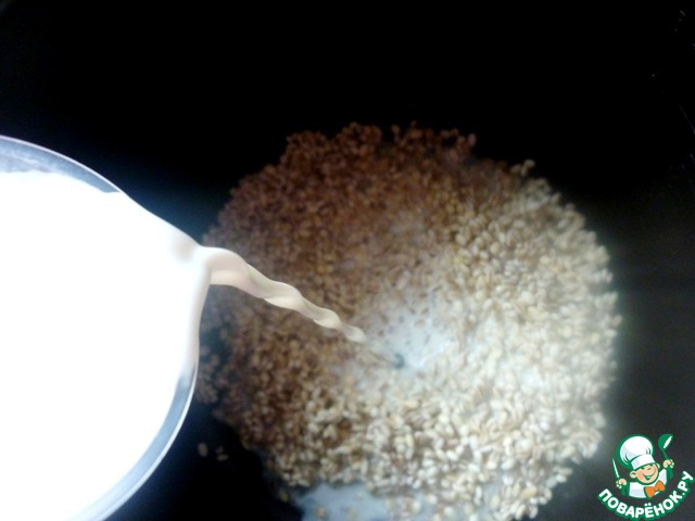 Промыть крупу, положить в чашу мультиварки, залить молоком и водой, добавить оба вида сахара и соль. Поставить на функцию "Бобы" ( у меня на даче простенькая модель мульти). (около 30 минут она готовится)