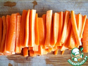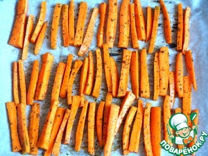 Противень застелить бумагой для выпечки и разложить морковь. Готовить в духовке, заранее разогретой до 180 град., 20-25 мин.