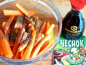 Добавить к моркови соевый соус Kikkoman, оливковое масло, чеснок и базилик.