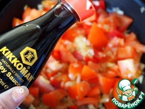 Добавить болгарский перец, помидоры, соевый соус Kikkoman, молотый перец.