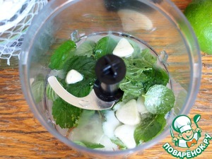 В блендер поместить промытые листья мяты, нарезанный чеснок, соль, ром, сок лаймов и оливково масло.