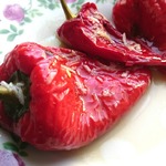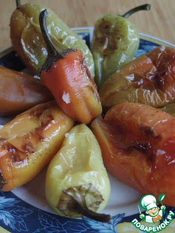 • Перец хорошо вымыть, проколоть вилкой с двух сторон и выложить на противень смазанный маслом. Запекать по 10мин с каждой стороны при 200 градусах