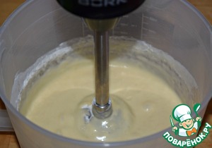 В яичную смесь добавить растопленное сливочное масло, просеянную с разрыхлителем и солью муку и перемешать.
