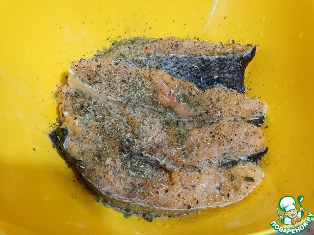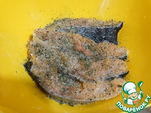У меня был целый кусок семги, без костей - уже разамороженное филе на коже. Время на размораживание не учитываем. Разрезаем семгу на порционные куски, обсушиваем бумажным полотенцем, посыпаем перцем, лучше его смолоть тут же, прованскими травами и чесночным порошком. Слегка втираем в рыбу. В отдельной мисочке смешиваем 1 ст. л. оливкового масла с соевым соусом, затем поливаем рыбу и даем постоять 5-10 минут.