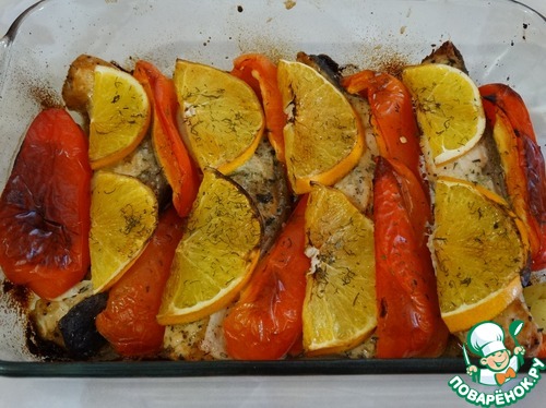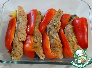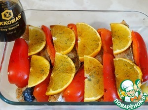 Форму смазываем оливковым маслом, укладываем рыбу, полив оставшимся соусом. Между рыбой выкладываем четвертинки сладкого перца.
