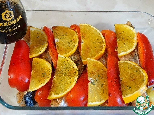 Апельсин разрезаем поперек на тонкие дольки, укладываем на рыбу. На каждый кусочек апельсина капаем соевый соус и посыпаем сухим укропом. Запекаем в духовке 15-20 минут при среднем нагреве.