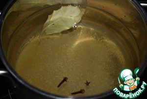 В кастрюлю налить холодную воду, добавить соль, сахар, лавровый лист и гвоздику. На среднем огне довести до кипения (сахар и соль должны раствориться) и влить уксус.