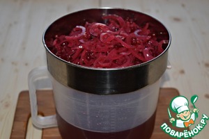 Перед тем, как готовить салат, откинуть лук с ягодами на сито. Маринад ни в коем случае выливать не надо. (позже расскажу, как можно его использовать)