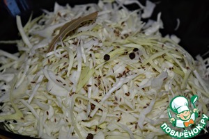 Белокочанную капусту нашинковать, добавить лавровый лист, несколько горошин черного перца и пару чайных ложек сухого укропа. Слегка помять ее руками и уложить в банку. -