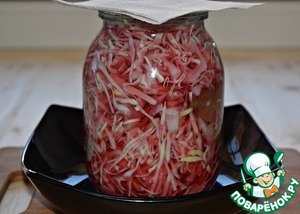 Банку прикрыть салфеткой, поставить в глубокую тарелку (рассол будет переливаться через край банки) и оставить при комнатной температуре на 2-3 дня. (периодически протыкать капусту ножом и вытекший рассол заливать обратно) Отличная капуста получается, скажу я вам. Вот такое безотходное производство!