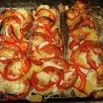 Нарежем пластами помидоры, картошку, болгарский перец и лук полукольцами. Лук перемешаем с майонезом, затем выложим равномерно на рыбу. Затем выкладываем картофель, посолим и смажем тонким слоем майонеза. После картофеля выложим перец по всей поверхности и сверху разложим помидоры, посолим и хорошенько смажем майонезом.