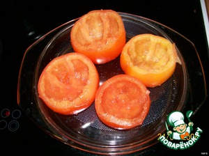 С помидоров срезать "крышечку" в том месте, где помидорчик прикрепляется к стеблю, ложкой вынуть мякоть, чтобы остались стенки толщиной 0,7-0,8 мм.