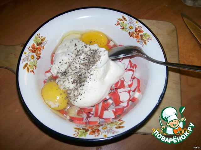 Все ингредиенты для начинки нарезать одинаковыми мелкими кубиками, яйца слегка взбить с майонезом, сыр натереть на мелкой терке.