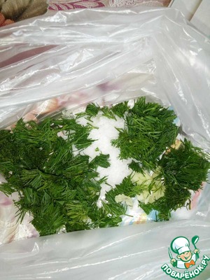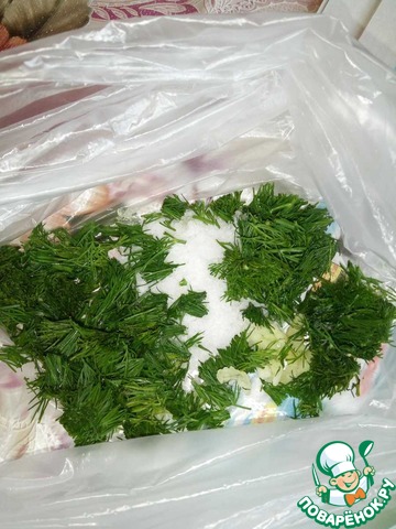 В целлофановый пакет высыпаем соль. Моем, очищаем от палок укроп, отжимаем, чтобы избавить от лишней влаги, режем, добавляем в пакет. Чеснок очищаем, выдавливаем чеснокодавкой и отправляем туда же.