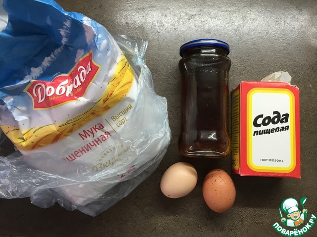 Первым делом готовим наши коржи: необходимо смешать в глубокой миске муку, гашенную соду, яйца и мед. Мы используем жидкий мед из одуванчиков, который заботливо приготовили в этом году. Можно взять и обычный мед, только его надо предварительно растопить на водяной бане до жидкого состояния.
