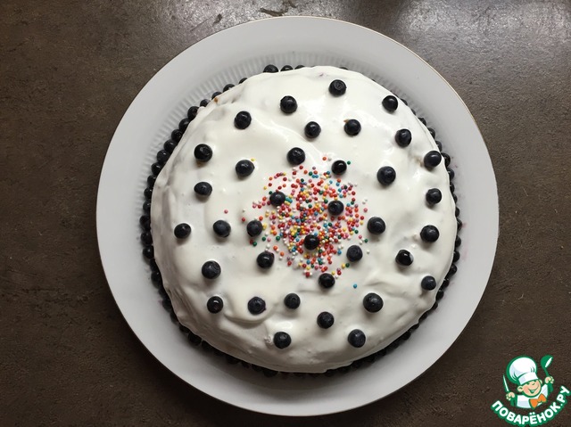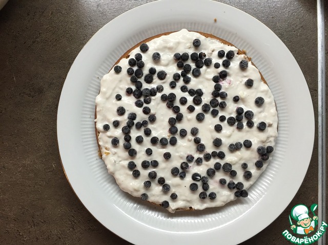 Теперь собираем наш пирог: нижний коржик, большой слой крема, сверху посыпать черникой; затем второй корж и повторяем до конца.