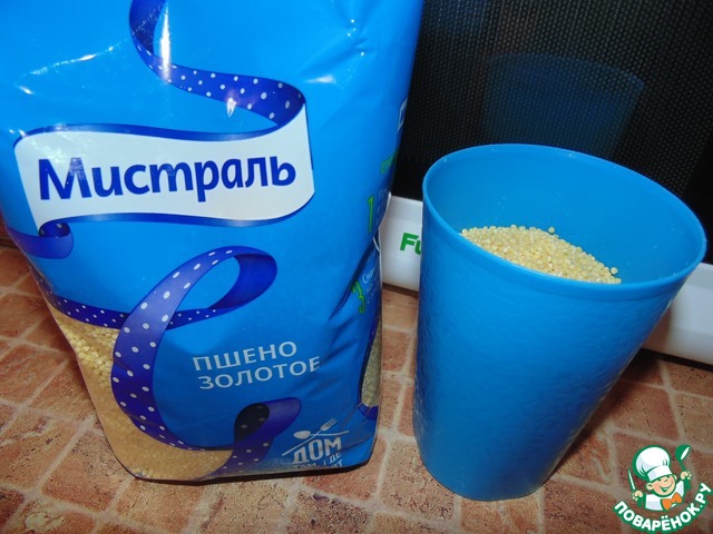 Один стакан пшена Мистраль хорошенько промыть. Отправить вариться в кипящую, соленую воду, 10-15 минут.