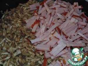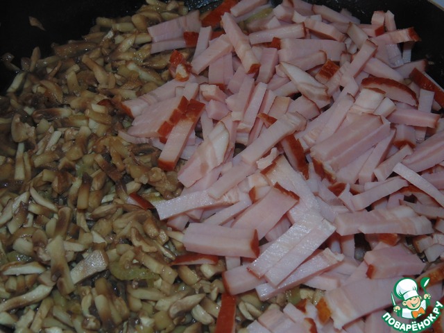 Добавить нарезанный соломкой карбонад или любое подкопчённое мясо. Перемешать. Готовить 2-3 минуту.