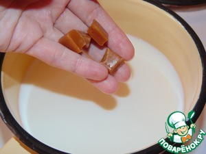 • В ковш с молоком положить ириски, включить небольшой огонь и довести до кипения, постоянно помешивая. Когда молоко начнёт закипать, ириски должны растаять.