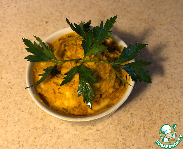 Равномерно распределяем получившуюся смесь по тыквенным долькам. Накрываем фольгой форму с тыквой и ставим запекаться в заранее разогретую духовку при t 190 градусов до мягкости тыквы. Точное время запекания я не засекала, но примерно через 40-45 минут проверила тыкву - она была достаточно мягкая для пюрирования.