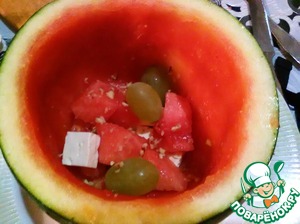 Во внутрь арбуза, произвольно добавляем мякоть, виноград, сыр и орехи. Таким образом заполняем всю полость.