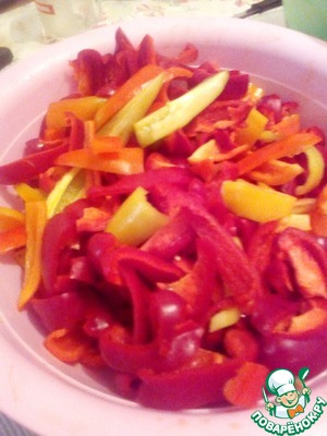Из того что осталось после приготовления салатов, я и решила приготовить этот рецепт. Но обязательно еще приготовлю. Перец порезать по вашему усмотрению, но не слишком мелко. Я порезала крупной соломкой.