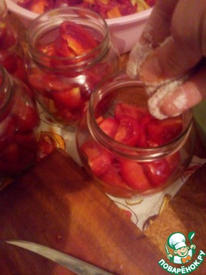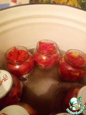 Стерилизовать заготовку 20-25 мин, с момента закипания воды. Так как овощи немного осядут в баночках, взять содержимое одной банки и разложить по остальным.