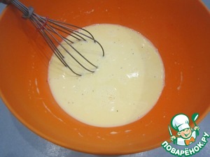 Начнём с того, что сделаем тесто для блинчиков. Смешаем яйца, половину майонеза ( приблизительно 90г), молотый перец. Ничего взбивать не нужно.