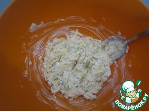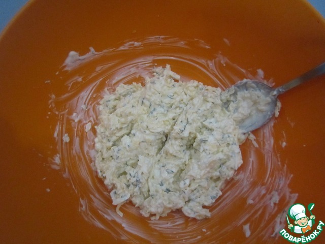 Теперь сооружаем начинку. Тут можете дать волю фантазии, но у меня так : сыр натереть на тёрке, выдавить туда чеснок и добавить оставшийся майонез. Выглядело вот так.