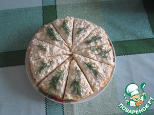 И собственно собираем нашу закуску. Блинчик, начинка, блинчик, начинка и т. д. Сверху украшаем зеленью и угощаемся. Такой тортик получается.