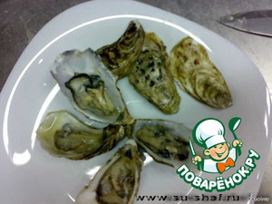 Закрываем вторыми половинками панциря устрицы и ставим на 10 минут в заранее разогретую духовку до 190 градусов. -