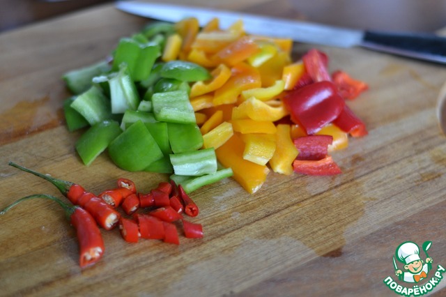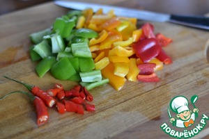 • Болгарский перец и перец чили нарезать на маленькие кусочки.