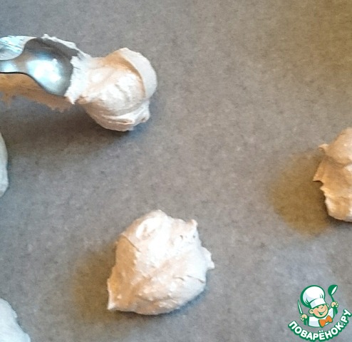 На готовый противень с помощью чайной ложки выложите наши безе. Обратите внимание, что безе маленькие, размером с 1 чайную ложку.