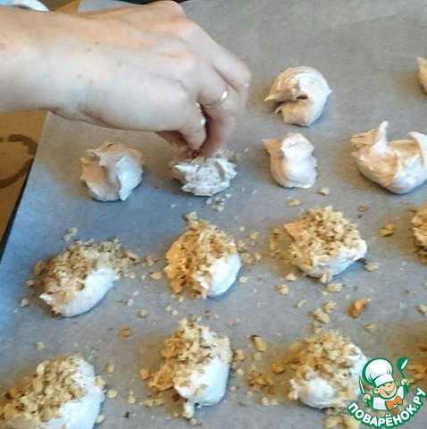 Размельчите 1/2 стакана грецких орехов (я делала это измельчителем от блендера) и посыпьте ими безе, "впечатывая" в белковую массу. Если вы не будете "вжимать" орехи в безе, то орехи посыпятся, когда безе уже испечется. Очень мелко рубить орехи не надо.