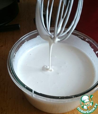 Не прекращая взбивать, медленно всыпьте 3/4 стакана сахара. Взбивайте ещё 10 минут, масса сначала сильно увеличится в объёме, потом начнёт становиться более плотной. Прекращайте взбивать тогда, когда с венчика при его поднятии вверх будет стекать густая непрерывная струя, как на фото.