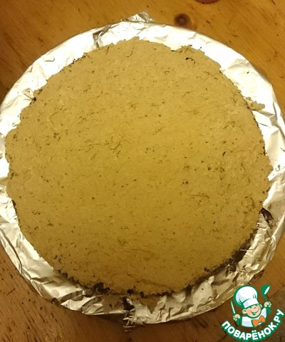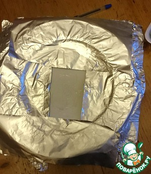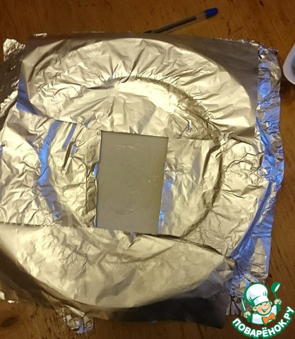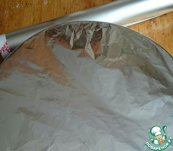 Приближаемся к сборке торта. Этот этап вы можете пропустить, но мне он оказался в новинку, и я решила попробовать. Тарелка, на которой потом будет подаваться торт к столу, выстилается фольгой вот таким образом. Серединка смазывается маслом.