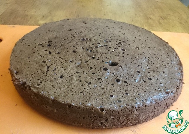 Это наш бисквит. Как видите, он хорошо поднялся и готов к тому, чтобы разрезать его на две части.