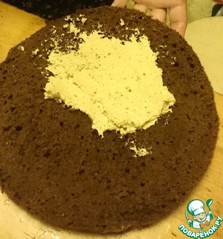 Теперь переходим к тому коржу, который мы откладывали в сторону. Он уже пропитан сиропом, теперь мы наносим на него тонкий слой крема, равномерно размазывая по всей поверхности