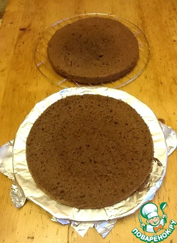 Этап 4 - сборка торта. Режем наш корж на 2 части, нижнюю кладем на тарелку, устланную фольгой, верхнюю убираем в сторону.