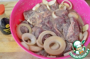 Говядину нарезать кубиками. Указанное количество маринада рассчитано на 2-3 кг мяса.