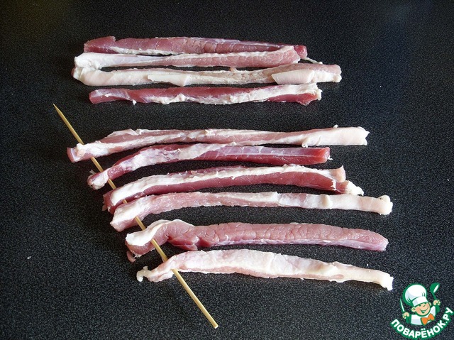 Затем я нанизал эти мясные полосочки на длинные деревянные шпажки. -