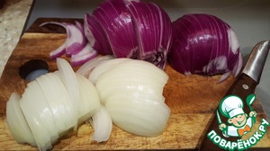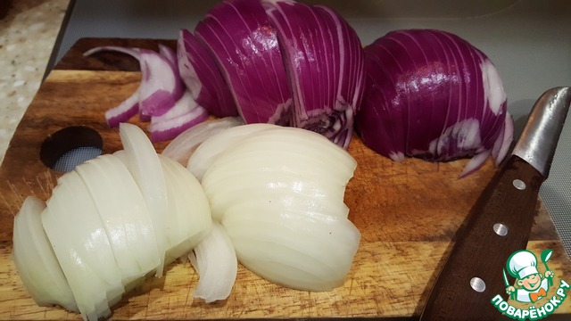 Почистить лук. Нарезать лук перьями, примерно по 1 мм толщиной.